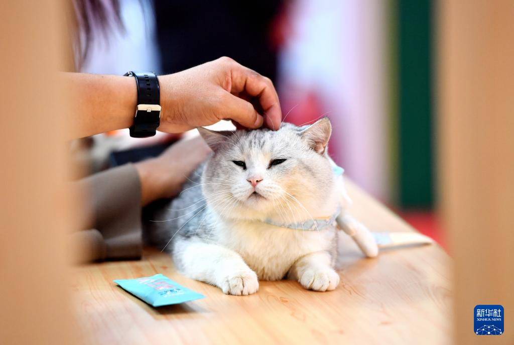 9月20日,观众在宠物产业博览会上与宠物猫互动。