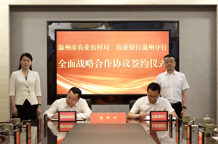 5月28日下午,温州市农业农村局与农业银行温州分行签署金融助力全面推进乡村振兴战略合作协议,计划未来五年内向温州乡村振兴提供总额不少于等值人民币700亿元的意向性融资额度,旨在贯彻落实中央和温州市委、市政府关于“三农”工作决策部署,共同探索形成金融服务乡村振兴战略有效模式,高水平推进温州市农业农村现代化先行市建设。