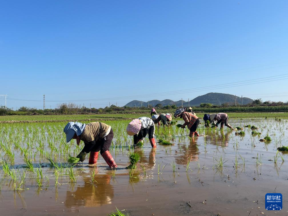 在海南省东方市感城镇,种农们在海南农乐南繁科技有限公司制种基地插秧。新华社记者 罗江 摄