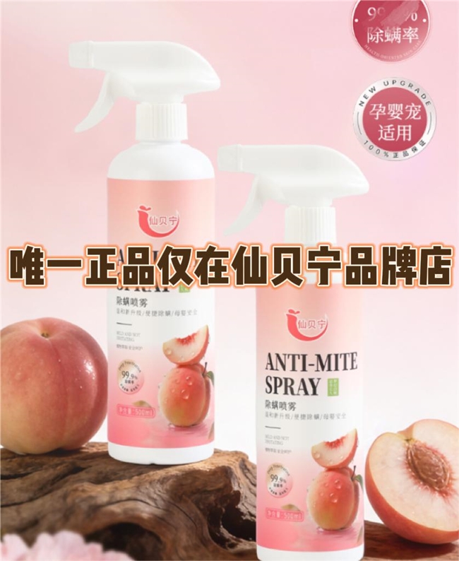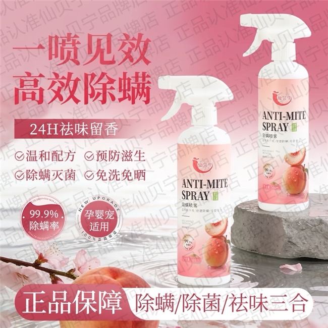 品牌:仙贝宁;产品名称:医护级植物抑菌除螨喷雾;香型:梦幻白桃(天然植物香氛,低温冷萃锁香);净含量:500ml(超大容量,家庭刚需首选);适用范围:床品、枕头、床垫、地毯、沙发、衣柜、毛绒玩具、空调出风口、家具,宠物毛发与睡垫,以及车载座椅、脚垫、后备箱等全场景;核心功效:99.99%除螨+99.99%除菌+99.9%虫卵清除,根源去除异味,40天长效防护,医护级标准,母婴宠物均可安全使用。