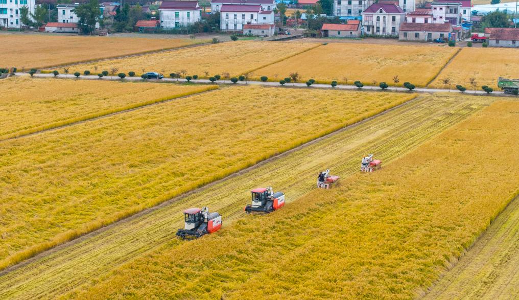 10月30日,在江苏省南通市通州区十总镇育民村高标准农田里,村民驾驶农机收割水稻(无人机照片)。 新华社发(翟慧勇摄)